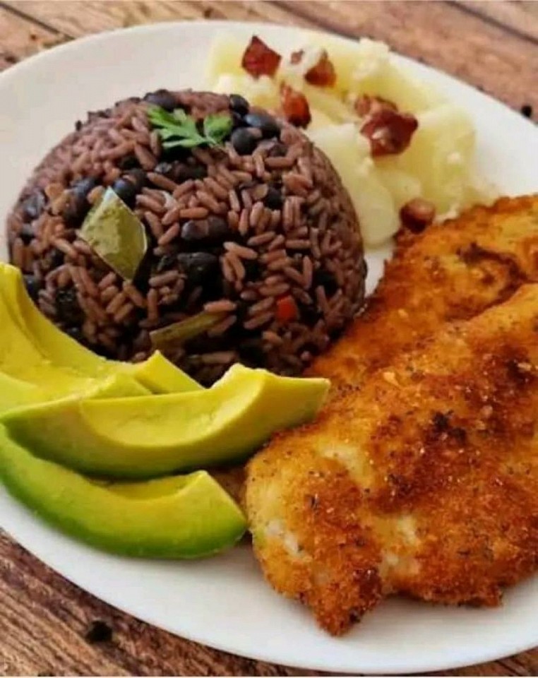 🥘Arroz congris ensalada mixta yuca con mojo y Canciller ( filete de pescado d mar empanado y relleno d jamón y queso.