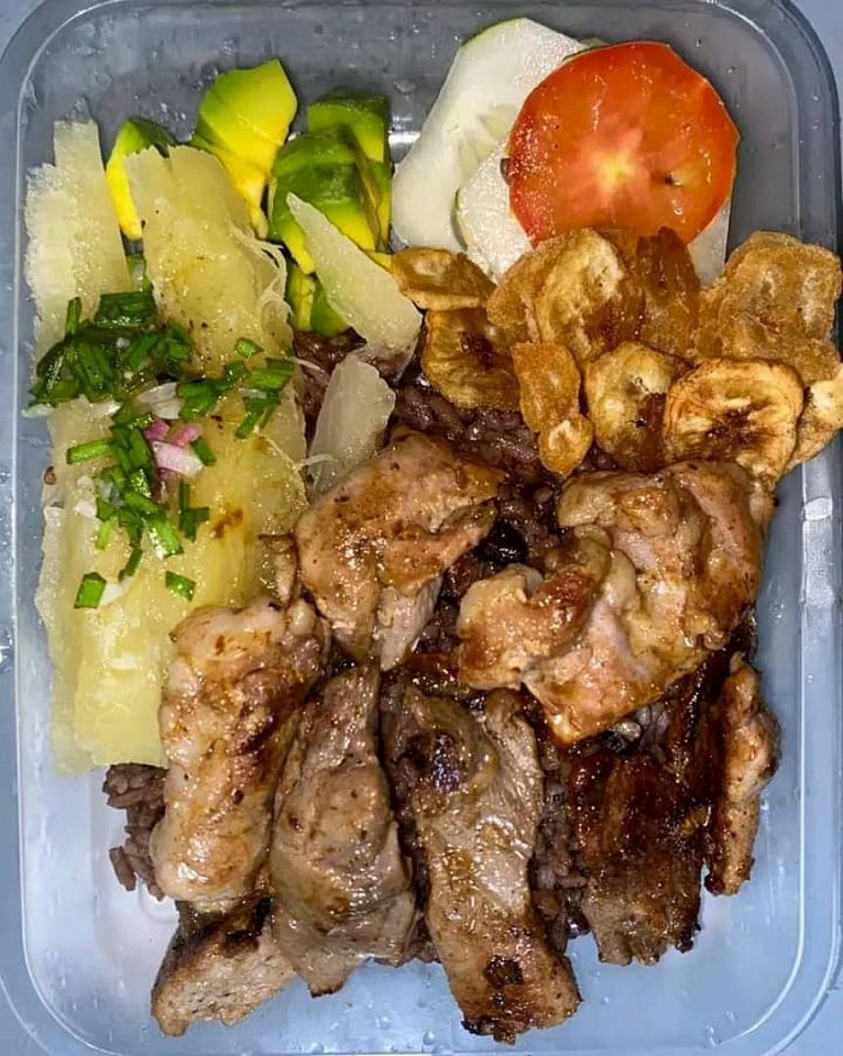 🥘Arroz con gris ensalada mixta yuca con mojo y fajitas de cerdo