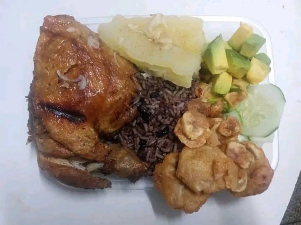 🥘Arroz con gris ensalada mixta yuca con mojo y pollo a la Golden blue